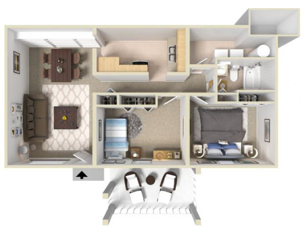 Two Bedrooms / One Bath – ~776 sq ft with two beds, shared living, and extra storage. Ideal for roommates or a small family. Parking and on-site laundry.