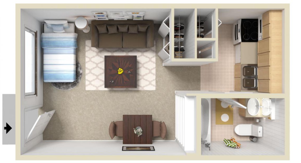 Compact studio at Stone Cove delivers a seamless living and sleeping zone, a practical kitchen, a full bath, and smart storage to maximize 288 sq ft of efficient, easy-care space.